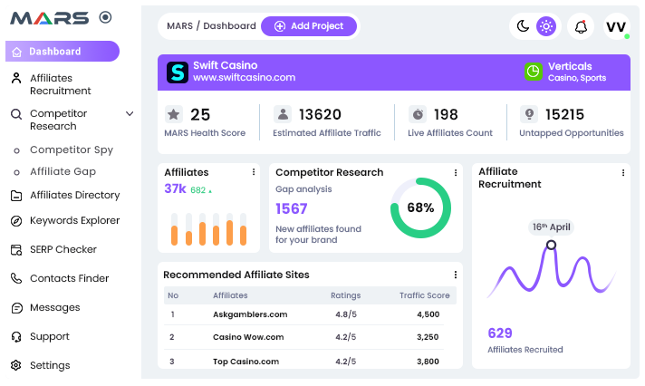 MARS™ is an AI-powered affiliate discovery and recruitment system built to accelerate your iGaming brand’s growth. It automatically finds top affiliate opportunities, analyzes your competitors’ affiliates, and identifies gaps you can instantly capitalize on. MARS™ doesn’t just discover affiliates—it finds their contact details, helps you engage them directly, and even promotes your brand to them. No more guesswork, no more wasted time—just intelligent, automated affiliate growth that delivers real results. By monitoring millions of affiliate pages worldwide, our proprietary AI technology automates discovery, uncovers traffic potential, and empowers you to optimize affiliate partnerships for maximum performance and profitability. Get started today and turn affiliate recruitment into your competitive edge. |