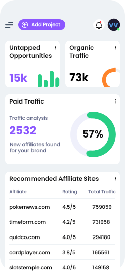 Access the most comprehensive database of iGaming affiliates in the industry. Our continuously updated directory contains thousands of verified sites across all markets and verticals. Each profile includes detailed metrics on traffic, authority, site quality analysis, listing opportunities and promotional patterns, allowing you to quickly identify and prioritize the perfect partners for your brand.