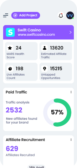 Discover untapped affiliate opportunities in the iGaming space with our AI-powered search engine. MARS™ continuously scans the web to identify relevant, high-performing websites that aren’t yet promoting your brand. Get instant access to a pipeline of qualified prospects that match your target markets, verticals, and performance criteria—all without the tedious manual research.